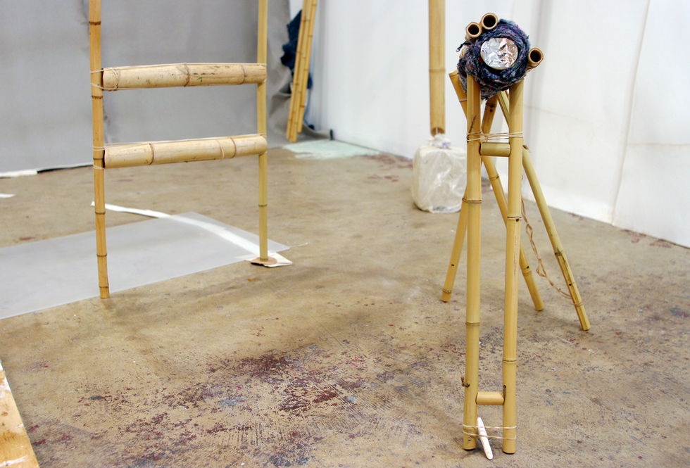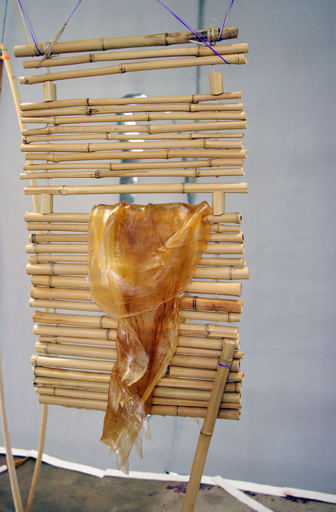 bamboo, interval timer, rubber bands, homemade ballistic gelatin with salt & ground red pepper, chewed gum, static shielding bags, clay, underglaze, light, empty package from China, 432hz tuning fork, silk, fan, staples, folded paper, sheetrock, burlap